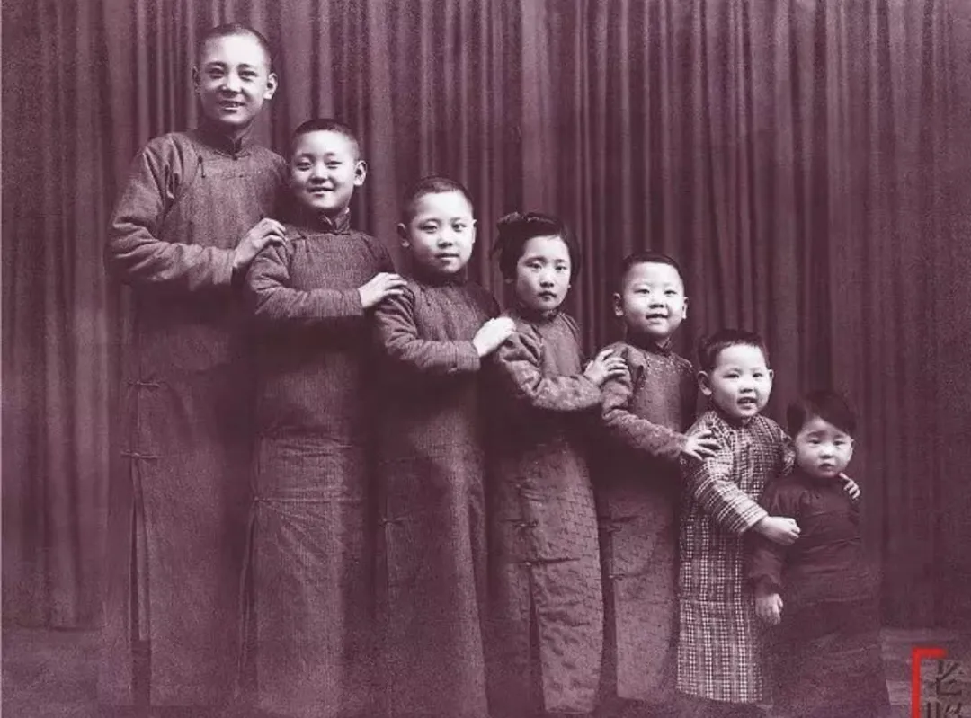 瞧瞧,队里拍照都没这气势,一排兄弟姐妹站得整整齐齐,大的搭着小的肩,最小的都还得人扶着,脸上全是稚气笑模样,穿的衣裳都是细布长袍,领子立着,袖口圆润,这家人风光不小,那年月能养得起七个娃,多少也算殷实人家,照片里看着温馨,谁说不是幸福的样子呢。