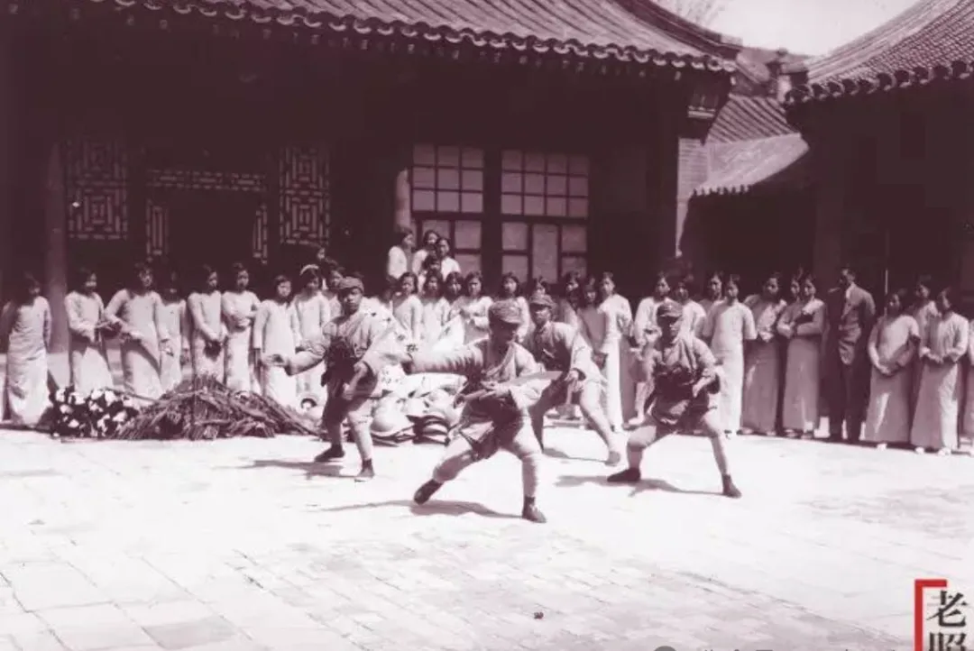 大刀队表演就在院里,三四个汉子摆出架势,后头一水儿的广东省女师女生围着看,动作扎实,刀明晃晃,气氛紧张,你别说,在那个时候,这样的表演很提神,姑娘们也都聚在一块,估计有人偷偷给闺蜜挤个眼,回家肯定得学上一两招,时代一转,女师成了记忆,大刀队也只在民俗里留着影儿了。