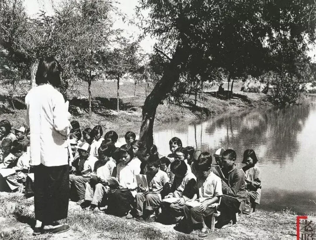 图上是野外河边,孩子们板凳一条条坐着,仰着头看老师,树下的阴影斑驳,课本翻着咔哒响,那光景一下叫人想起上秋游那阵,别说教室,靠着树干听讲也踏实,衣服旧,上课的劲头可一点没少,妈妈常念叨,有书读哪还分坐哪,风吹过,书页起波,这种日子远了,现在的娃娃怕是讲不明白那股乐趣。