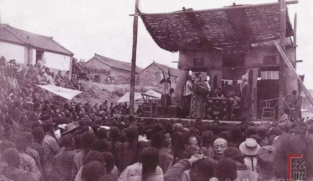 一年到头最盼的就是村口的戏台搭起来,图里舞台不高,布匹遮着台顶,台下黑压压一片人头,每个人伸脖子抢着看,老人家抱着孩子,嘴角都挂着笑,那时戏班来一场,整个村子都挤在一块,看戏不光是听唱腔,是图个热闹,是大家伙能一起乐呵一回。