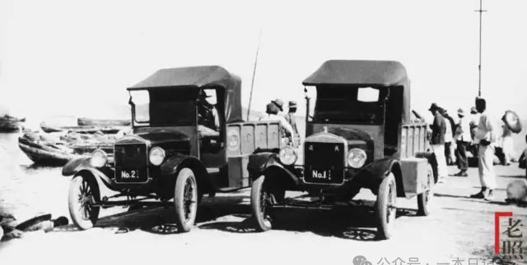 这画面有意思,两辆小汽车横在滩头,黑亮的车身,窄窄的钢圈车轮,前挡风直挺挺,车牌写着No.1 No.2,当年第一批开进威海的家伙,说“魔鬼车”可不全是开玩笑,老百姓见了都颤巍巍,谁能想到现在满街都是车,那会儿有辆就能当宝。