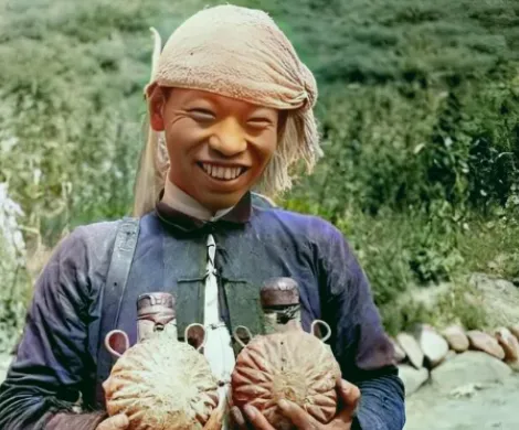 图里的爷孙俩正坐在门口,这男人身上穿的叫土布老衣裳,斜阳一照颜色发灰,衣服领子洗得发白,线头全都打结藏着,看着不起眼,但结实耐蹭,一件能穿好几年