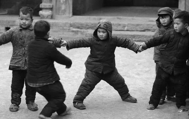 这张别看只是孩子们在院子里玩,其实说起来就是小时候的自制小剧团,一根棍子贴几张纸片,头上带个小狮帽,摇头晃脑就能演一出“打虎英雄”,邻里小朋友全围了一圈,拍手叫好,有大人一边看一边教动作,“你那杆子别晃,枪法要正”,一场热闹能招来半个胡同的人,冬天屋里冷,大家都往日头下凑,越冷越不肯散。