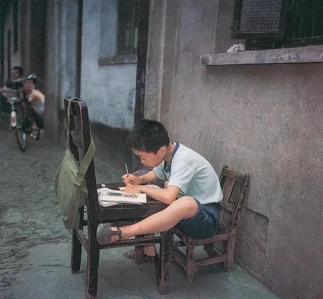 说到认真劲,谁也比不上这张巷口写作业的小桌案,桌椅腿都短一截,涂得发白,一身短裤一双凉鞋跷着脚,笔杆握得死紧也怕写不完,书包搭椅背,俩椅子一高一矮,这种姿势只有那时候见得多,现在的孩子作业桌都带灯光护眼,咱小时候家门口巷子里露天写,邻居路过还顺口夸一句,“这娃真懂事”。