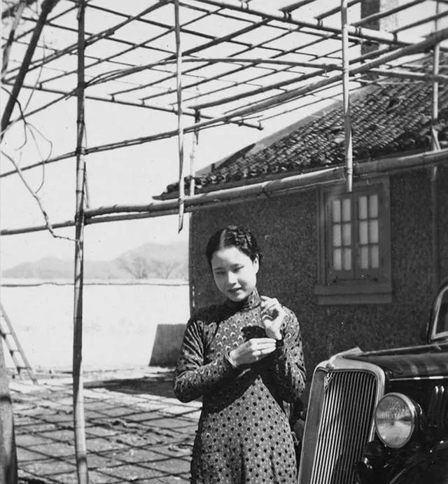 第一张最抓人的,是那位站在汽车旁边的女子。旗袍贴身,头发梳得整整齐齐,手里像是拿着小东西,神情很安静。旁边那辆汽车的车头一露出来,整个年代感一下就变得具体了。原来在那个时候,旧式房屋、竹架棚子和西式汽车,已经能出现在同一张照片里。