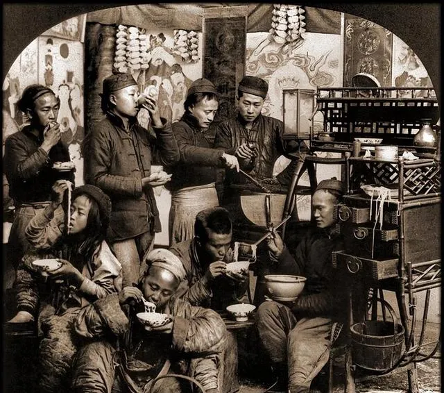那张一群人围着吃饭的照片,我看了挺久。没有桌椅,大家端着碗,蹲着、站着、靠着就吃起来了。碗不讲究,地方也不宽敞,可每个人都吃得很认真。后面挂着东西,旁边还摆着担子和木架,像是边卖边做的小摊。这才是真正的街头生活,不精致,但有烟火气。