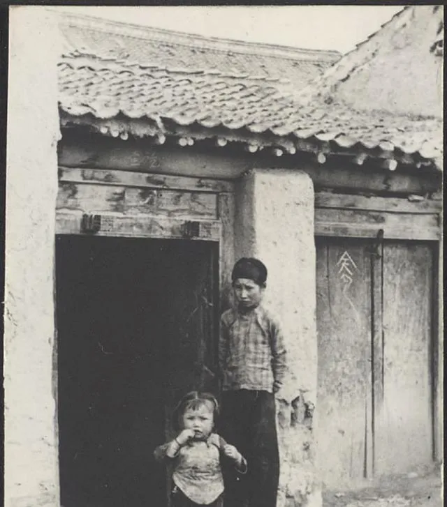 两个孩子站在自家门前那张,我特别喜欢。门洞不大,墙皮斑驳,大一点的孩子靠着门框,小一点的还把手放在嘴边。没有摆拍感,却很真。以前的孩子多,带孩子也没现在这么“精细”,大孩子看小孩子,门口、院里、巷子边,就是他们一天的活动范围。