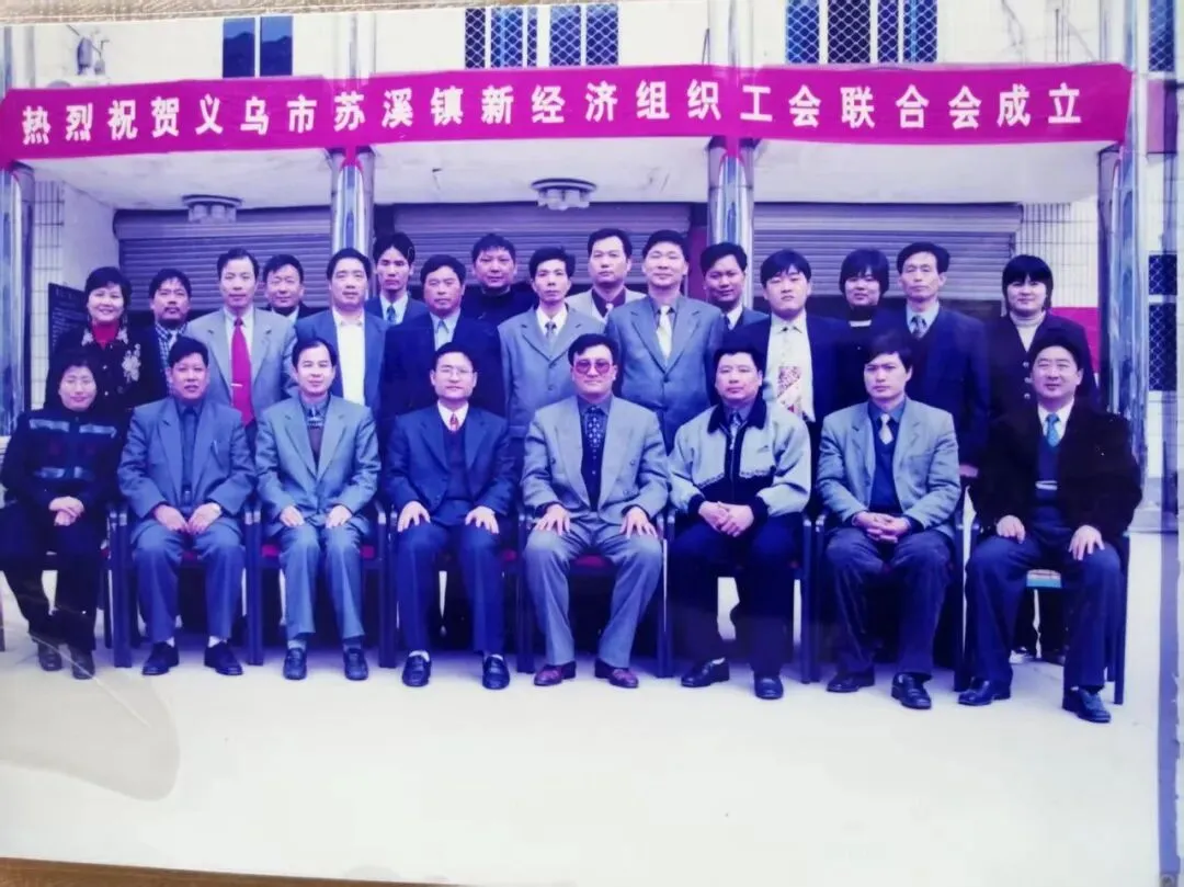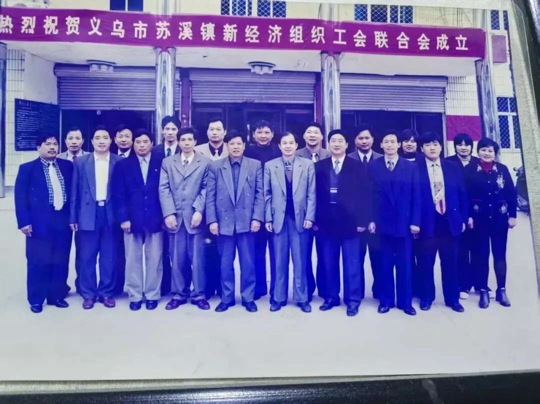 本组两张老照片,为义乌市苏溪镇新经济组织工会联合会成立时的合影留念。其中第一张照片后排左七,是邢宅村的李成道。