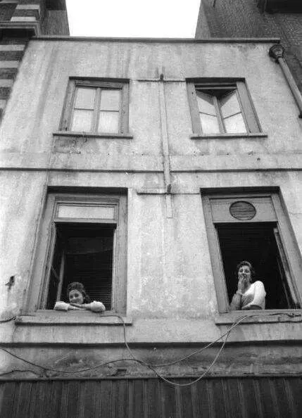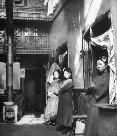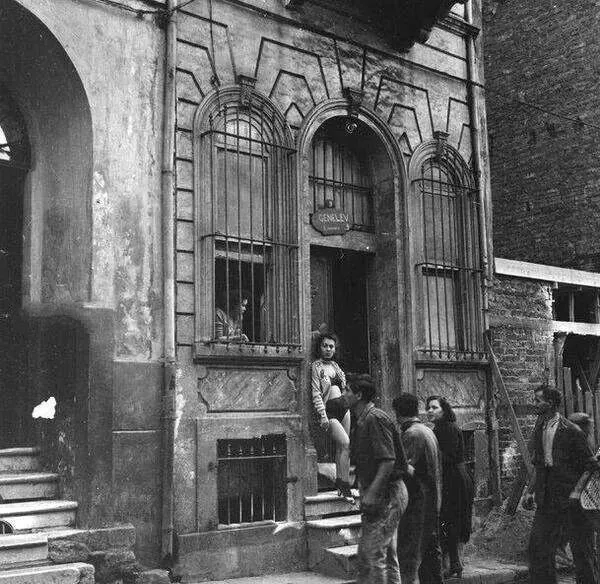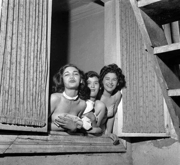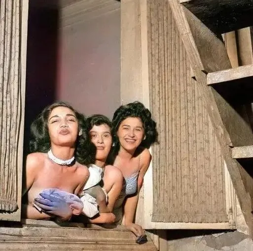这个画面叫人一下就回到上世纪五十年代,三个人挤在窄窗台上,笑得敞亮,大波浪头发一排排卷得齐整,皮肤在昏黄灯光下泛着光,谁说这样风尘女子就都苦着个脸,这张照片里看着都挺利落,领口一点点褶皱,脖子上白珠子项链,还都戴着手套,左边的姑娘朝外吹了个口哨,劲头十足,可见那种生活也不是只有呻吟和无奈。