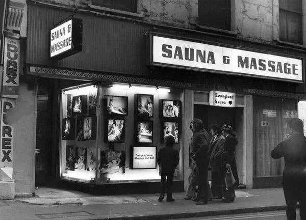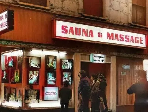 英国六七十年代新鲜事不少,这张图里的招牌写着**“SAUNA &; MASSAGE”**,下头一橱窗花花绿绿全是姑娘照片,左边母女两个往里看,小妮子追着问妈妈:这地方能进吗,妈妈顺手把她往边上拉,说一句你快走吧,这不是小孩儿逛的地儿,广告牌下,人来人往,谁也不好意思多停脚。