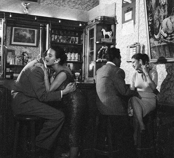 图中这叫欧洲老酒吧里的夜色,一边女人搂着男人脖子咬着耳根子说悄悄话,另一边低头手指绕头发,姑娘穿着窄裙,吧台后排着一排酒瓶,气氛混着烟味跟皮革味,妈妈看这个摇头:现在哪还有这种抠门酒吧,八十年代还能一杯酒聊半宿。