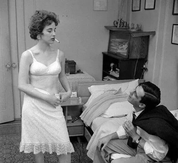 这个场景见得多了,五六十年代美国都市租房里,姑娘穿着内衣,烟叼在嘴里,什么也不在意,男人坐床沿抬头嬉皮笑脸讲条件,衣柜后仿佛还堆着行李箱,这么多年过去,屋里的气息隔着照片都能闻到点香烟和熏衣草油的味道。