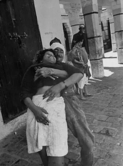 北非的主妇有他们自己的生活,男人抱着女人满脸憨笑,女人顺手将烟夹在手里,裙子皱巴巴,胆大的还能盯着镜头笑一笑,背景里立着柱子,傍晚鬼市刚收摊头,人家生意忙着呢,哪有空理谁拍照,只有笑意是真心。