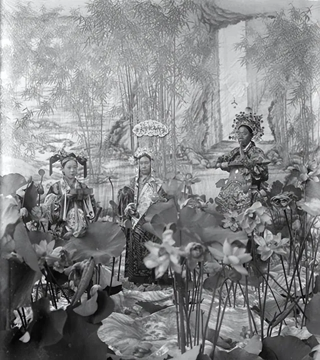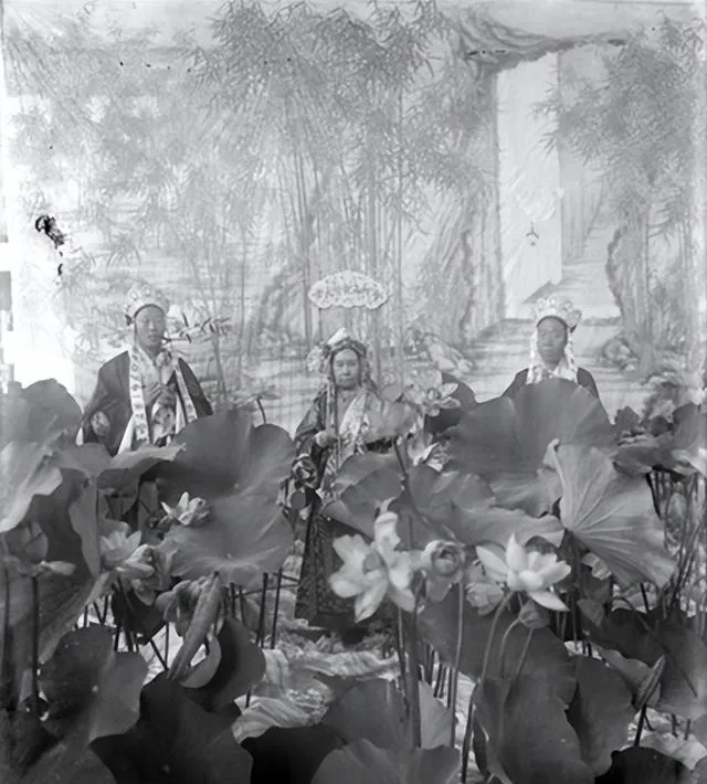 图里中间那个就是慈禧太后扮作观音菩萨,左右各立着一位宫女,造型模样也专门变装成了善财童子,头戴饰物,衣袖宽大,站姿带着舞台意味。最有劲的是,这一池子的荷花根本不是天然长出来的,全是宫里特意搭的假景——荷叶高高举着,前后错落,竹林也嚷着背景铺开,活脱脱“普陀山”的气氛往屋里一搬。说句实话,平日你见她批折子,一身庄重,谁能想到还能穿戏服摆在莲花池正中,不说还真不敢信。奶奶以前开玩笑讲,新年里老家唱戏等角色都要“抓阄”,慈禧这架势,哪是抓阄,全场说了算,殊不知,这也是权力到头的某种“自由”。