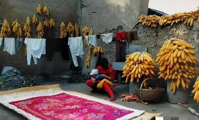 农家小院地上铺着大红被面,玉米一排排挂墙上,妈妈坐在小板凳上哄孩子,阳光斜过院墙撒一地金亮,这样的黄蓝对比和人间烟火气,别指望超市大楼里还有。