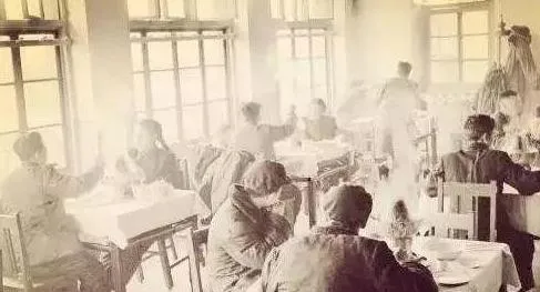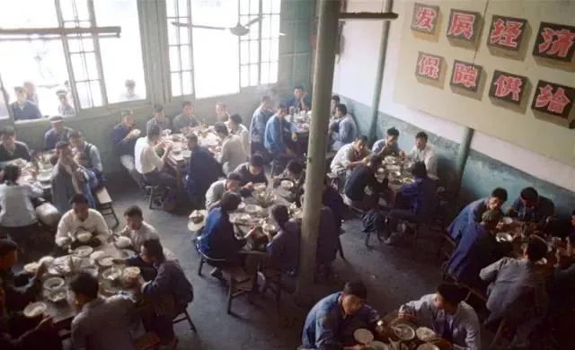 最后这张,真像把70年代饭店的样子一下子摊开给人看了。高窗、大厅、圆柱、木桌、长凳,屋里坐得满满当当,墙上还挂着大字标语。没有背景音乐,没有装修风格,只有吃饭的人、说话的人、端碗的人。热闹是热闹,但不是今天那种喧哗,而是一种很朴素的生活声。有人埋头吃,有人端碗喝汤,有人刚坐下。那时的馆子,装着的其实是最普通人的日常盼头。