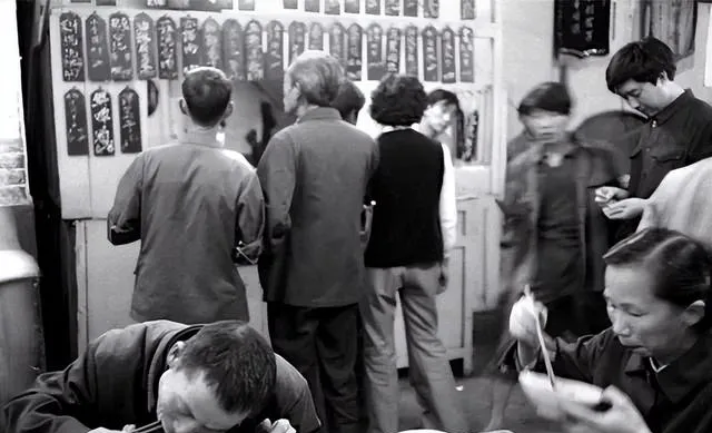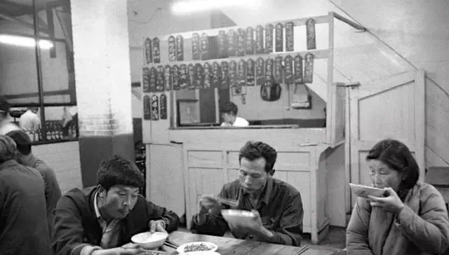这张最能说明当年的“下馆子”到底是怎么回事。门口围着一群人,有人进,有人等,有人像是刚买完票。那个时候很多饭店是先买票,再等着叫号,服务员不一定给你端到桌上,轮到你了,自己去窗口取。今天的人可能很难想象,吃顿饭还有点像办事。可也正因为这样,仪式感反而更强。进去之前先把钱和粮票准备好,脑子里早就盘算好吃什么。像素材里提到的,一碗阳春面八分钱,肉丝面一毛多,听着便宜,可别忘了,当时普通工资也就三四十块,学徒工更少。按收入算,真不轻松。