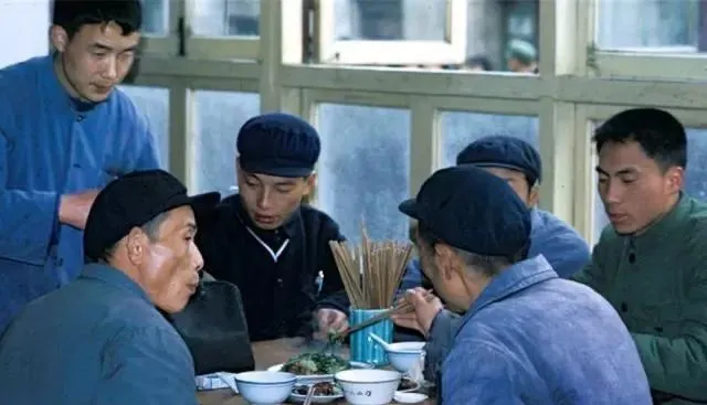 这一张最有“下馆子”的热闹劲儿。几个人围着一张桌子,桌上菜不算多,中间插着一筒筷子,大家一边吃一边说话。穿着几乎清一色的蓝、灰、绿,帽子一戴,那个年代的工人气质一下就出来了。这种场景,以前多半是发了工资,或者来了外地亲戚,几个人凑一顿。不会铺张,但也不会太寒酸。你家里老人要是经历过那个年代,看到这里大概会说一句:那时候能下馆子,已经算过得不错了。