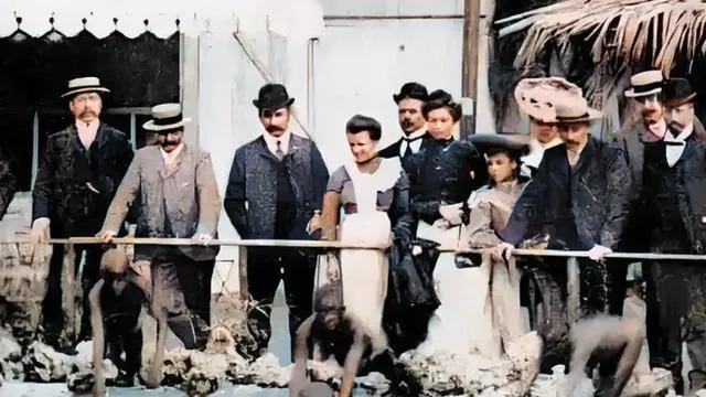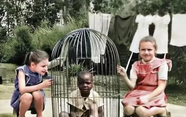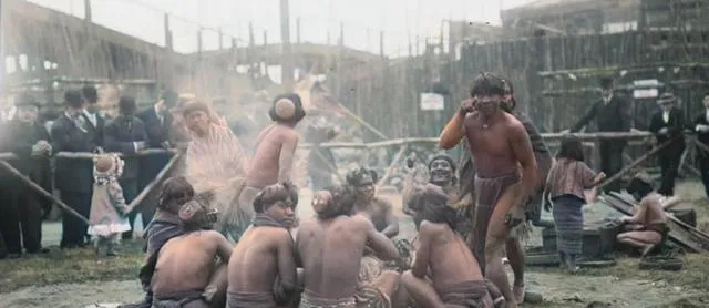 图中这块地方叫人类动物园展池,一根横杆,隔开了两种世界,一边戴礼帽穿呢大衣,眼神都是看动物的神色,池子里瘦巴巴的土著母女挤一块儿,有人指指点点,台上笑得开了花,底下只剩不停发抖的肩膀,这种场面搁现在真没人愿多看一眼。