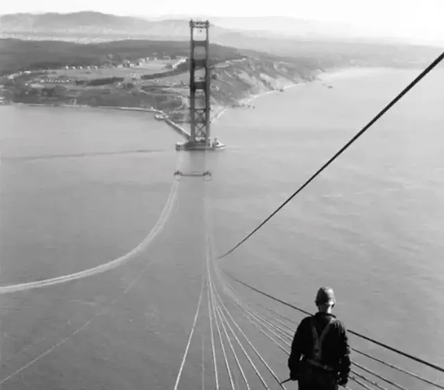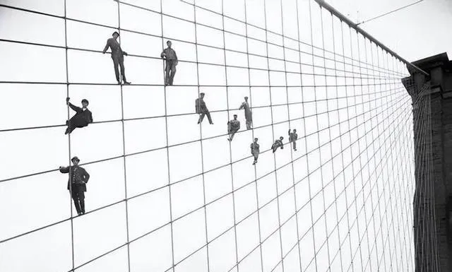 画面上的主角不是人,是一大绺主缆子,黑影一个个挨着坐在上头,身子像悬在天上,后头的城市看不见细节,全都蒙在雾气里,工人背影贴着细线一样的钢缆,谁一低头,脚底板都是空的,以前修个大桥人全凭胆和手,现在安全设备是上来了,大桥却依旧要人命吊着往前爬。