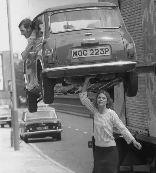 小车子被一把托举起来,广告片的点子,明明就是个玩笑,车窗里人露半拉脑袋朝外乐,旁边路人刚顿了一下脚,立马又走了,“你别说,这小巧玲珑的还真有点灵气”,和后头一水大块头比着,就剩轻快和俏皮了。