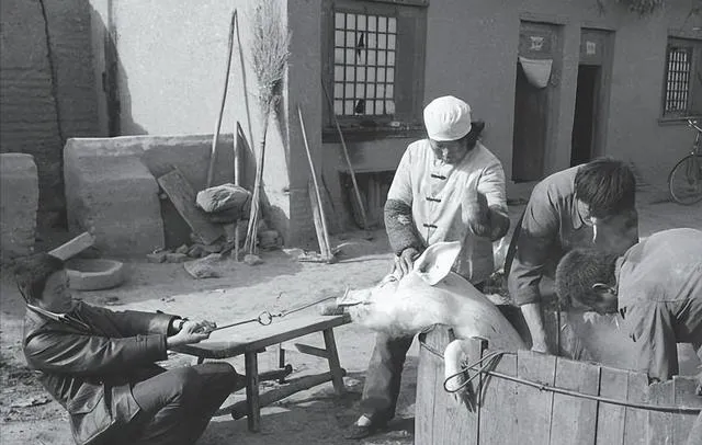 这一张,几乎就是很多人记忆里的年根儿。院子不大,几个人围着一头猪忙活,旁边有人使劲拽着绳子,地上摆着木桶、扫帚、案板。说实话,这种画面现在年轻人未必见过,但对不少上了年纪的人来说,一看就知道:快过年了。
