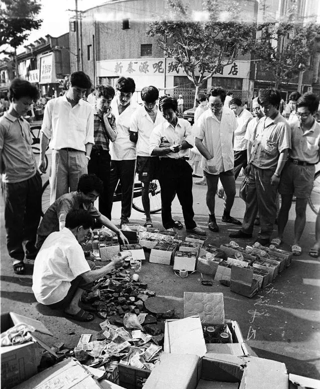 几个年轻人围着地上的摊子看,纸盒子、零件、杂货摊了一地,卖的人蹲着,买的人站着,个个低头盯得认真。这个场景很有八九十年代街头味道:不是商场,不是超市,就是马路边一块地方,买卖就做起来了。