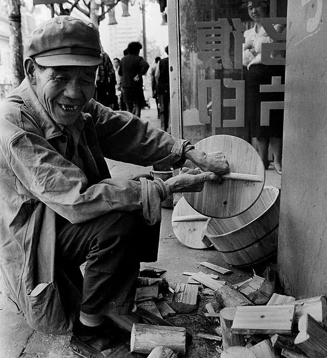 后面这几张,我觉得特别有劲儿。修木盆的、补锅的、敲敲打打的,旁边放着木屑、铁盆、锤子、小凳子。手上全是活儿,脸上却很平静。这种手艺人以前街边常见,谁家盆裂了、锅漏了,不急着扔,先想着修修还能用。
