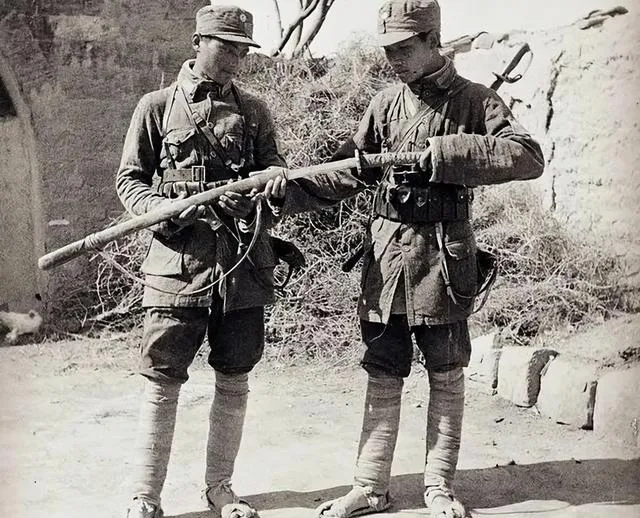还有一张,两个人穿的都是褪色灰衣裳,带子胡乱扎着,腿上裹的是绑腿布,脚下草鞋算新,手上摸着步枪,太阳一照不觉得旧不觉得脏,这就是当时八路军的底色,啥流光溢彩,到了日头下就是落地生根。