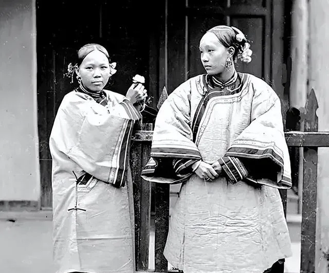 这两位女眷身上的衣裳厚实带点亮,绣工也舍得下,头发梳得溜光贴服,还别着几朵花搁耳边,一手举着花枝一手叉腰,气场足着呢,我有几回看家里老照片,也找不到这种神色啦,现在谁还会在自家门口这样站着被拍,那会儿拍一回照片,比过年还稀罕。