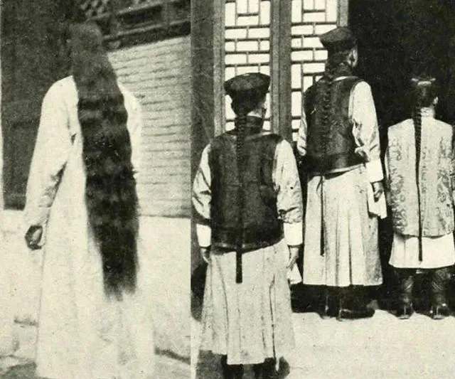 这照片里的男人,头发盘成鼠尾长辫,从脖子垂到腰,前面几位靠墙站着,背影扎眼得很,这种发型搁今天算奇观,小时候家里老人还说过,“剪辫子那会儿哭得厉害,多少年一出门都拎着怕人笑”,清朝那点讲究,留在一根辫子上都能写出本书来。