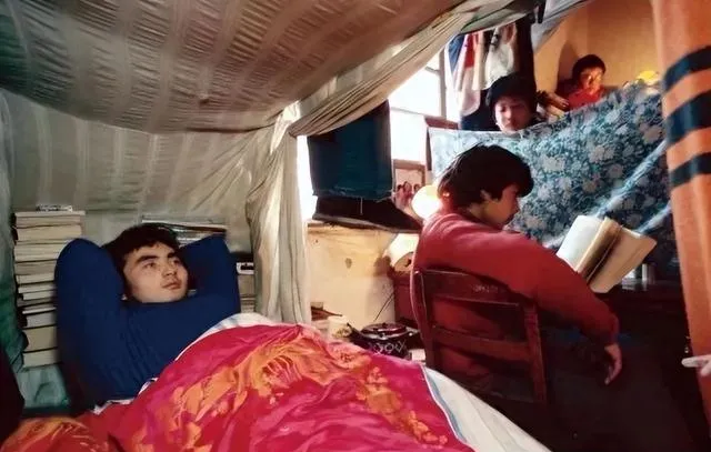 最左边那哥们正躺着晒太阳,床单花哨,看得出来那年代的大学宿舍低矮逼仄,上层挂帘子遮个面,书叠得老高,一屋子空气闷着热气,冬天冷天窗缝风也漏不进来,桌子边两个人正翻书,屋里没啥讲究,书多个人也杂,有时候晚上小卖部里凑钱买瓶汽水,几个人摇两下轮流抿一口,说现在的学生宿舍装得花里胡哨,一点没那个烟火气,是实打实的寒碜里头透点温暖。