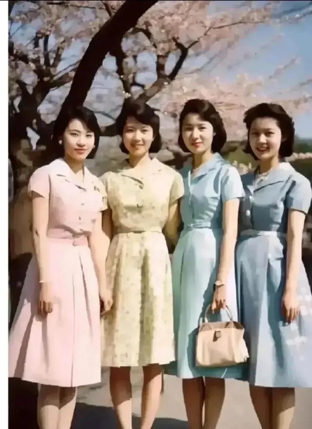 这组四个女孩子,一个个站得笔直,裙子全是浅色或者蓝色系,头发梳得一丝不乱,手里小包精致,纯净脸庞没有一丁点杂念,春天的花开得正盛,行走树下落英缤纷,有时候小姨会说起她的同学那会儿穿最喜欢的蓝裙子,路过小河都忍不住照照影,都说美是一种气质不是牌子,眼里笑意流转出来,才是真的经典。
