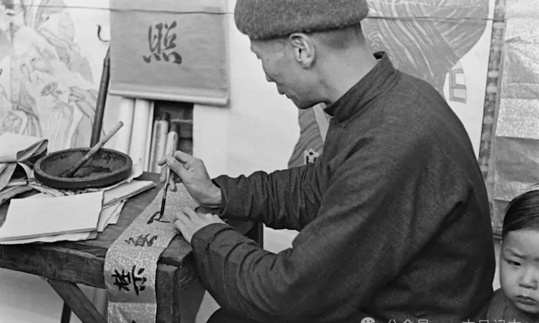 图中这位大爷靠一手毛笔写春联,每年腊月整条街都能听到刷刷写字声,摊上一摞红纸,笔蘸着墨汁一笔一顿,写的多是避邪驱凶、辞旧迎新,写得还不赖,周围孩子全盯得出神,老话说字写得好才能镇得住场子,春联是一家门户的脸面,以前印刷可没普及,全靠师傅手上那点功夫,妈妈每年都拉着我去选一副,说是要找个吉利气,看着心头亮。