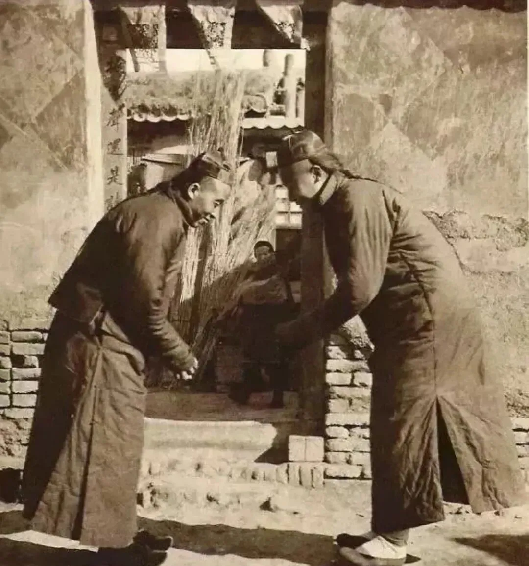 这俩穿长袍的人正拱手作揖,这叫拜年作揖礼,那时候朋友邻居见了面讲究一个礼数,两手抱拳相对一哈腰,这是平辈间最实在的年味问候,邻居串门先问好再说话,小时候学着跟大人作揖,每次手势总拿捏不对,奶奶在后头笑着教,时间久了,这一套动作成了旧时光的印记。