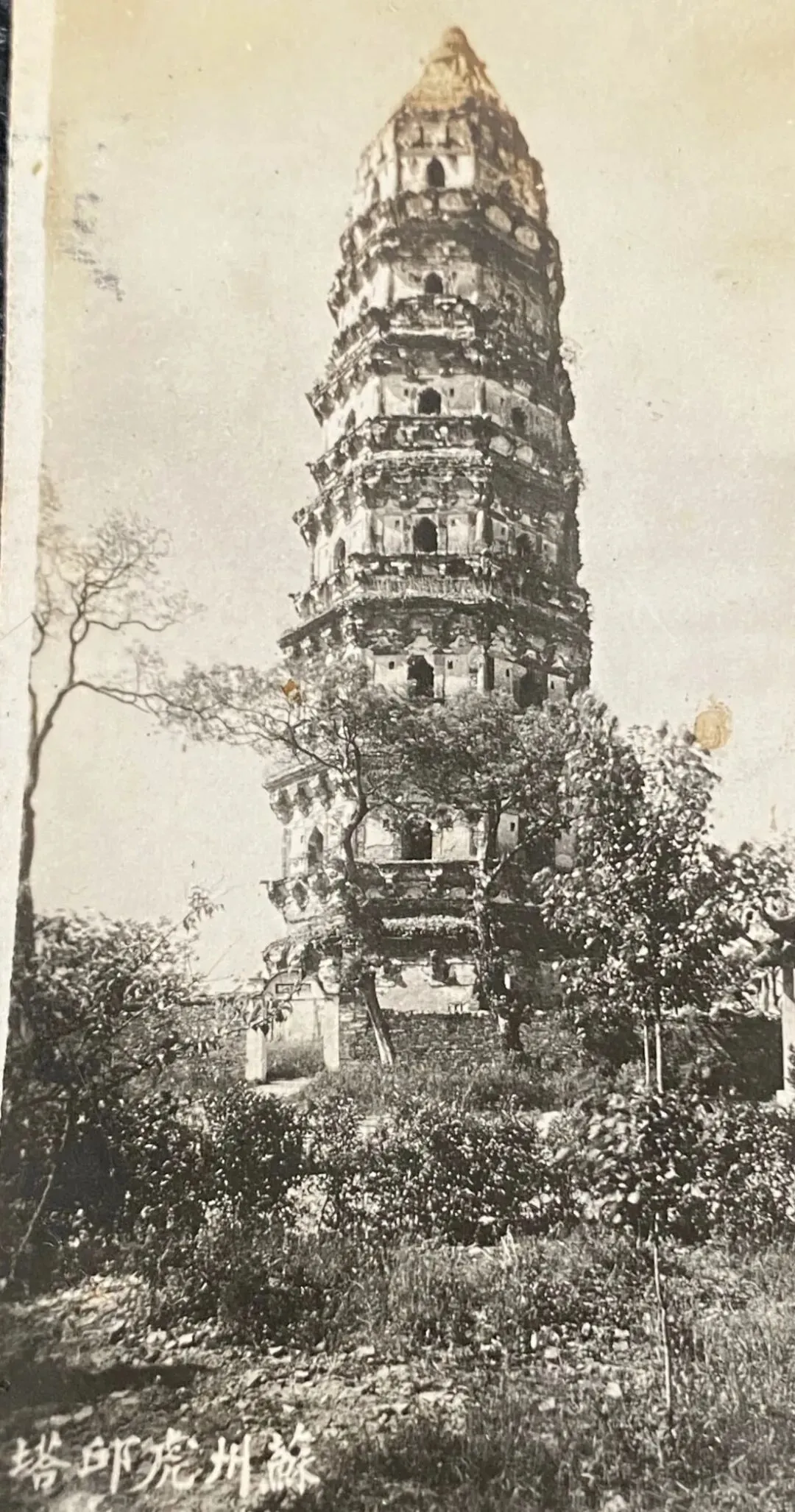 这张老照片,摄于约百年前的民国时期。图片中的虎丘塔历经战火浩劫,木檐与殿宇已在烽烟中化为焦土,只余这座砖石塔身孑然独立。它身披岁月的斑驳,以一种苍凉而倔强的姿态,孤零零地屹立在山巅。周围草木荒疏,环境静谧甚至带几分凄清。