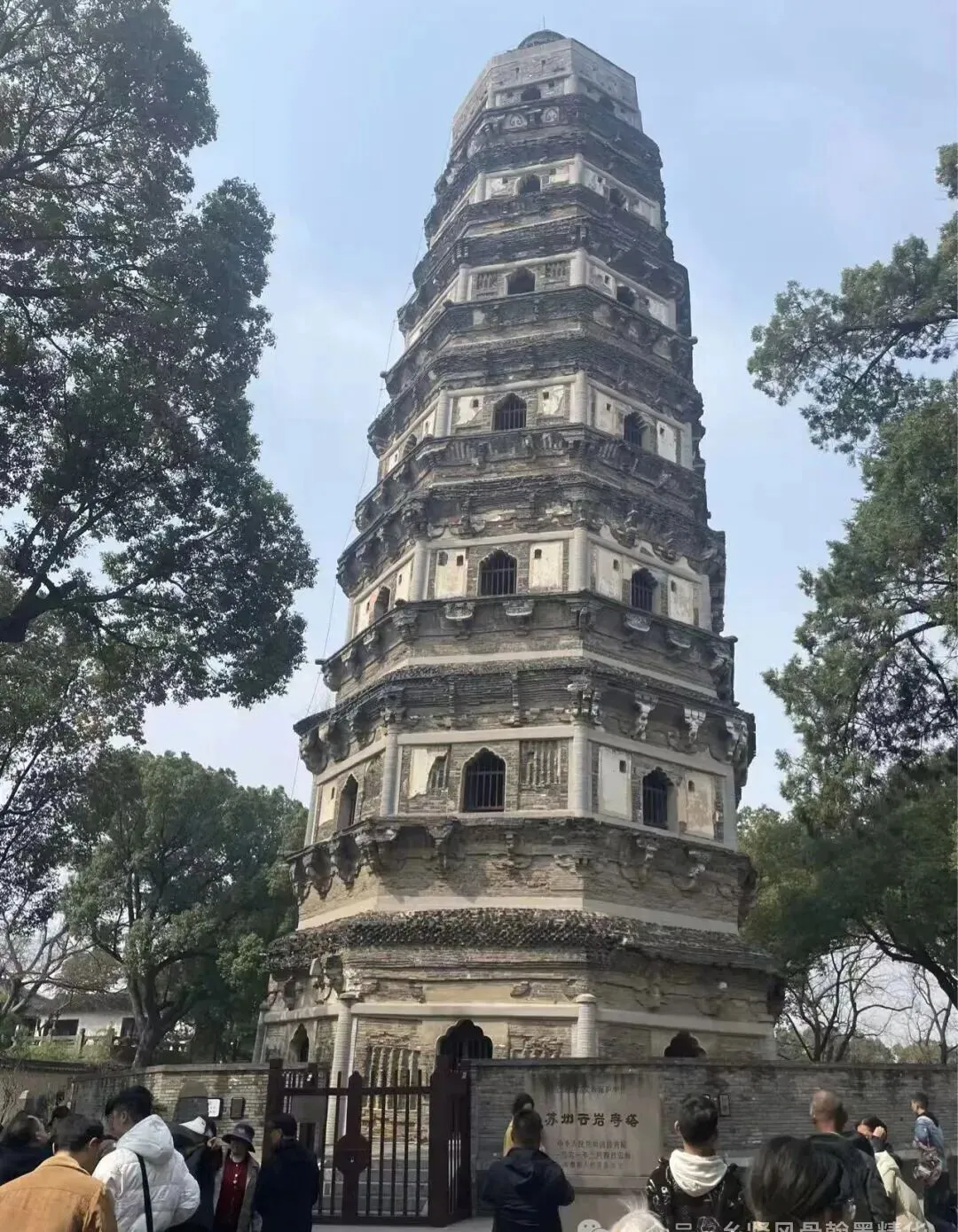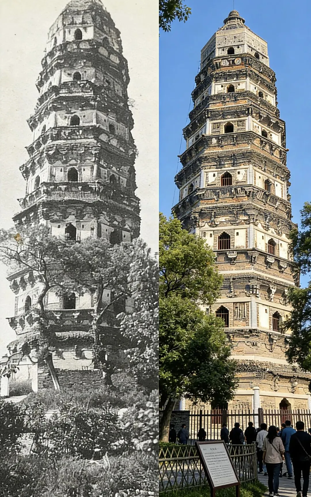 新照片的虎丘塔已焕然一新,经数代文物工作者的抢修与加固,塔身稳固,姿态雄伟。