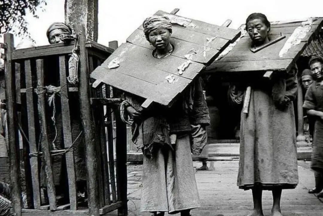 这张两种刑具打包照,左边那个就是站笼,犯人塞在里头,手脚直挺着,敢弯一会儿就喘不上来气,旁边两个戴着大板枷的,也是常有的场景,木头枷锁死死卡住脖子,头一抬全是压痕,枷上还粘着罪状白纸,家里老人说电视剧里见多了,现实可一点都不轻松,那会儿只要被绑出去晾人,面子里子全丢了。