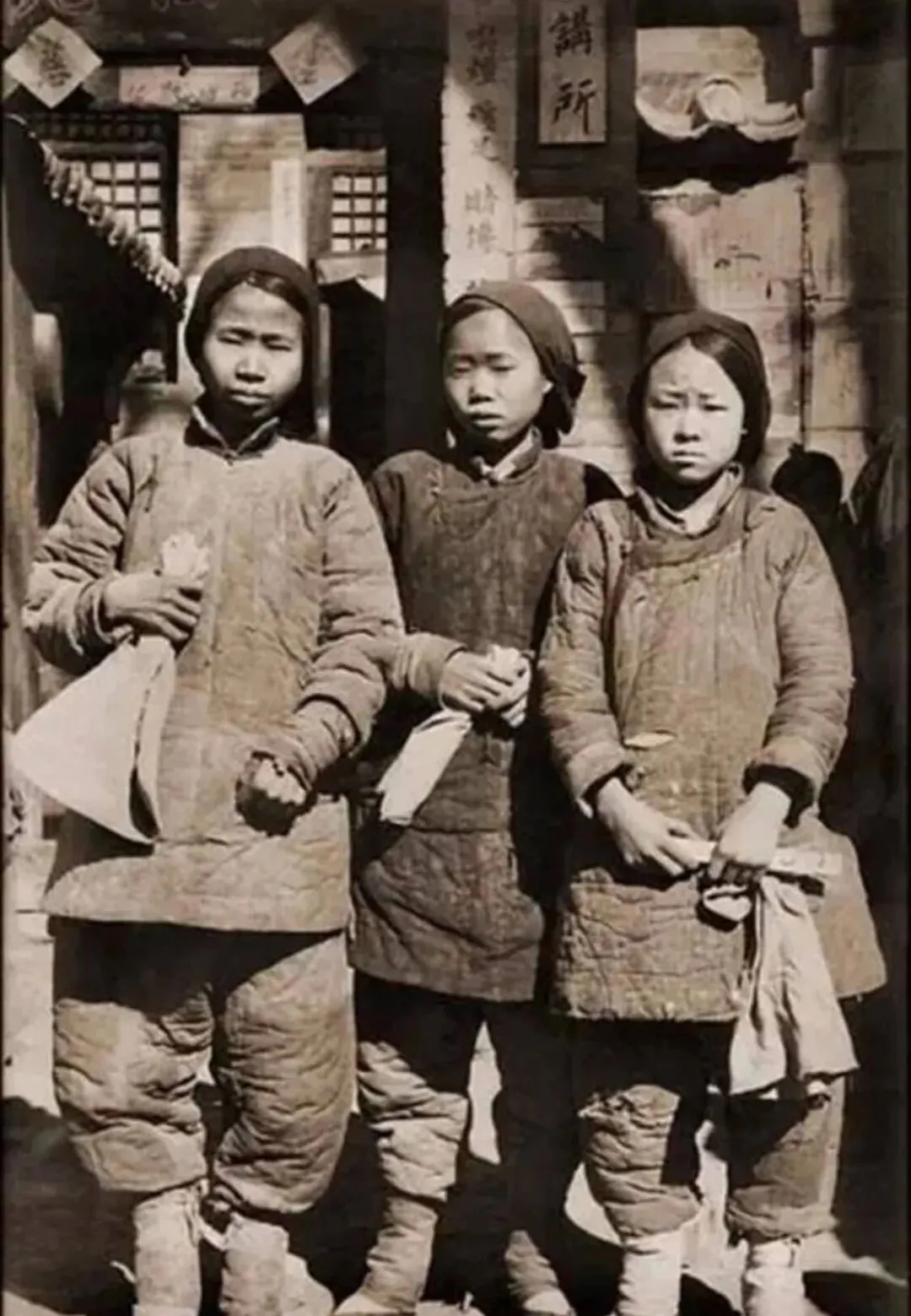 这仨丫头站在街口,大冬天裹着厚厚棉衣,脚下一样是包得死 tight的缠足,不论贫富,这规矩一点都不能少,远远看去步子短得像撇拉,好多人说现在中国都难找见这样的脚了,老照片也把那一代人的辛酸全留下了,再瞧现在,谁还忍得了这种罪。