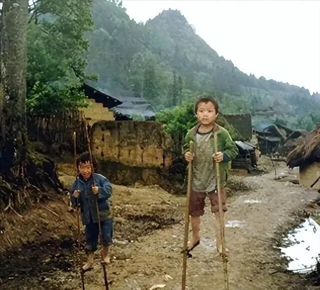 图上两个小孩踩着的家伙叫竹高跷,乡下孩子的玩意,长短不一,挑根结实的大竹子锯成段,脚踩的那头绑着横棍,刚下雨路面满是泥,踩着这玩意走一段又不怕弄脏裤脚,说不定爬高还能摘点桑葚桃子,小时候邻居家二狗子练得溜,天天在院子里噔噔地走,摔破裤腿也不怵,人小胆大,现在城里的孩子别说玩了,见都没见过。