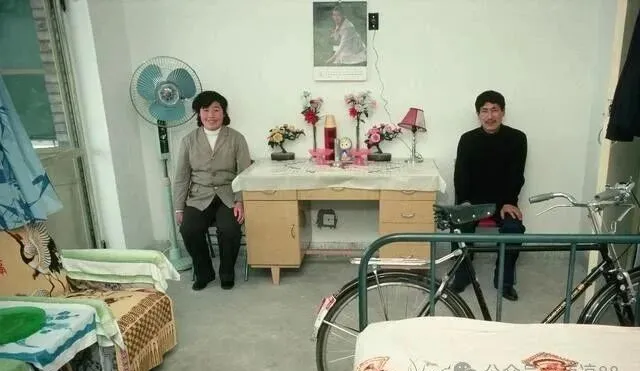 新婚夫妻的合影场面,老三样少不了:电风扇、自行车、梳妆台,床单和沙发罩花花绿绿,墙头贴着明星海报,案头摆香皂、塑料花,照相师傅喊一句“不许笑太大”,两口子坐得直直的,一屋子新气息和小紧张劲都能透过画面溢出来,那会结婚没什么排场,桌上有两碗糖,串个门就凑一堆人,现在成箱的婚庆用品都按斤称,过日子的心劲反倒淡了。