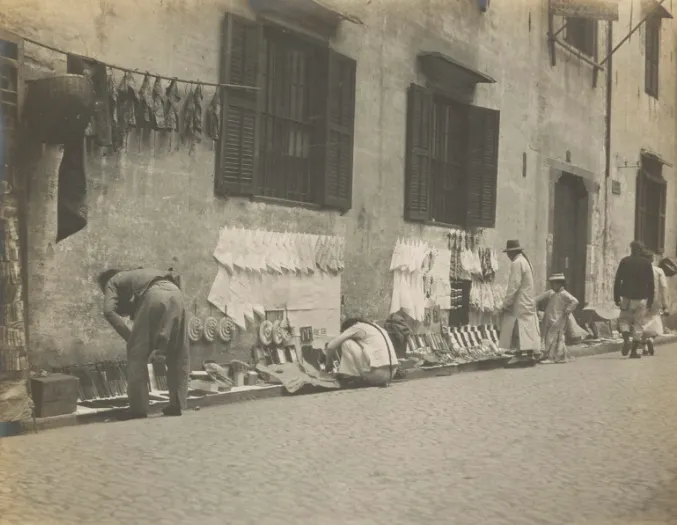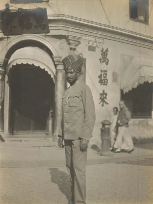 一名印籍巡捕站在万福来店前。