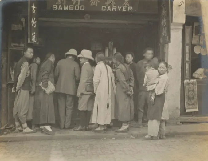 围在宏兴斋竹刻铺子前的顾客们。