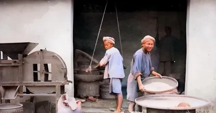 图中这地方是老米坊,两个小哥儿一人拎着大筛子,一人忙着倒米,身上的布褂汗过几十遍,都发白了,后头推出来的磨机全靠手摇,颗粒全靠眼瞅着选,小时候爷爷一直感慨,**“那时候一碗米不白来,操的都是实劲,没体力撑不住。”**现在按一个按钮就走流程,米香不一样,手感差很远。