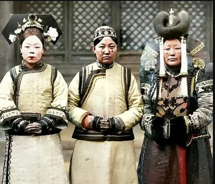 这张照片里的三位,是典型的旗人贵妇,发饰高高翘起,头顶刮得油光锃亮,旗袍上都是手工绣花,袖口翻起还看得见里头的细线,脚到地就是花盆底,走起来一点响动都没有,表情木木的,谁家女眷小时候能有这待遇,奶奶说,她之前只敢在街上远远瞅一眼,**“旧社会身份大,不是谁都能靠近这么一身家当。”**跟现在小姑娘逛商场试新衣,心气那是一个在天一个在地。