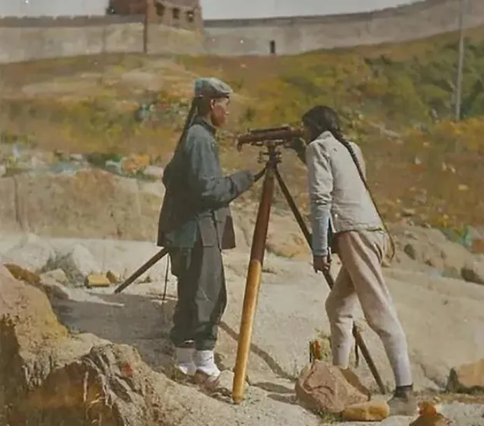 这张真稀罕,左边这位脑后拖着长辫子,穿盘腿裤,手里却抱着一个黄铜做的测量仪,三脚撑在地上,右边的小伙正眼巴巴蹲着瞅,家里二爷以前见过类似的,“那年修铁路水利,清朝人样样都要跟着新规矩,不会的只能边学边干。”辫子配洋机器,看着有点怪又真实,跟现在咱们用大屏手机刷短视频,那会儿能摸上仪器的就是开天眼,时代眼见着拐弯。