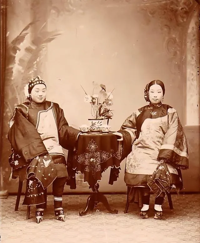 这张照片里的两个女人衣着华贵,桌上摆满了小器物和插花,一个脚底还穿着花盆底鞋,姿势拘谨但有分寸,眼神不扎人。照片色调偏黄,像是用粉往脸上抹过似的,奶奶说这种打扮的多半是在大户人家待久了,规矩一层一层裹着,遇事还得低头,日子再好,笑都收着,只能照片里露一回。