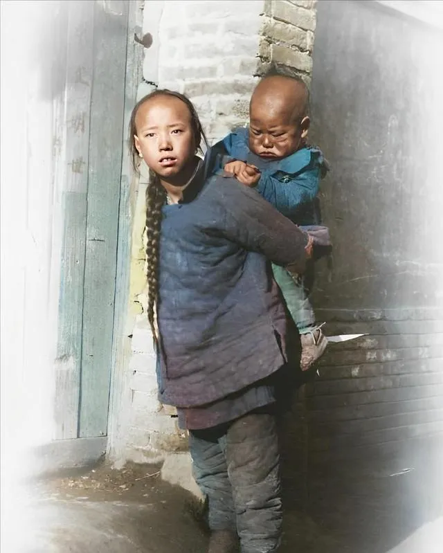 画面最戳心的是这姐弟俩,姐姐头发梳得紧紧的,背上却扛着个瘪嘴的小弟弟,裤脚满是泥土,家里没进米,衣服旧得泛白,小女娃咬紧了牙,朝着前头走,弟弟困得头也不抬,老一辈人说,小时候就是这样,苦日子都带着兄弟姐妹挨过来,能撑到出门挣钱已经不错了。