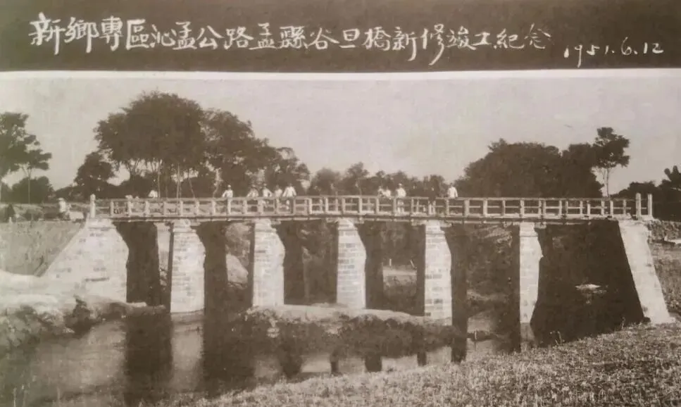 这张桥的照片很耐看。桥身不花哨,石墩结实,桥面平平稳稳地横在水上。上面还有人走动,说明它不是“景点”,就是老百姓每天踩来踩去的路。你看这种桥,最容易让人想到一句老话:日子就是一步一步从桥上走过去的。如果不看题字,很多人未必能想到这是1950年代的孟县谷旦桥。