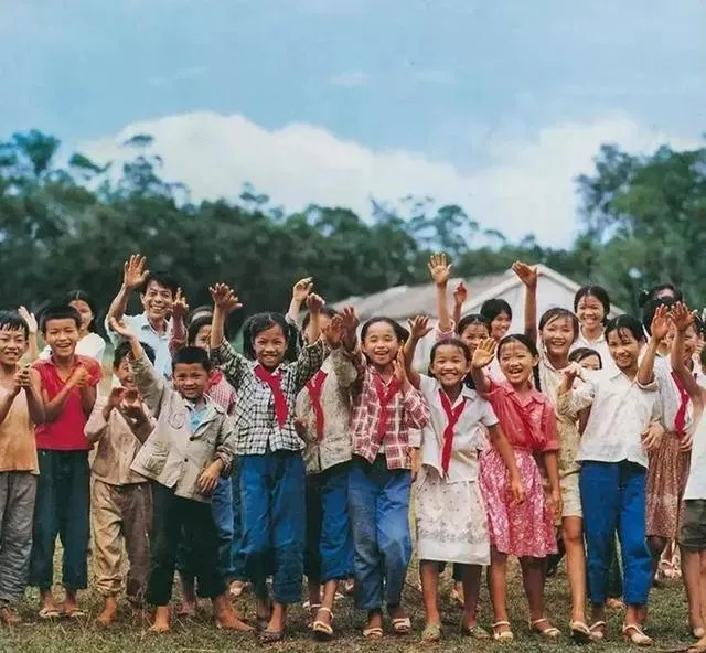 图上一群孩子,穿着蓝裤褂子、土布衬衣,脚下凉鞋翻毛边,笑得没遮没掩的,脖子上红领巾一串亮眼,没人管谁的新谁的旧,只要集合一站,谁都自信得不行,操场子是泥地,天是干净的蓝,衣服花色八成一个样吧,但每个人的童年都能晒出不一样的光,这种集体笑声要多少有多少,可惜现在城市孩子很难碰上了。